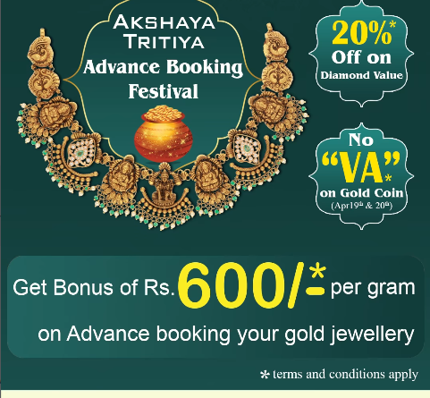 Akshaya Tritiya Advance Booking Festival — 20% off on diamond value + Rs.600/- bonus per gm on advance bookings. Visit Coimbatore Jewellers Salem today.