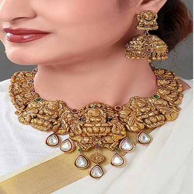 Antique or matte gold looks are trending on its temple sets that vintage, heirloom-like appeal appears beautiful with bridal wear and silk wear