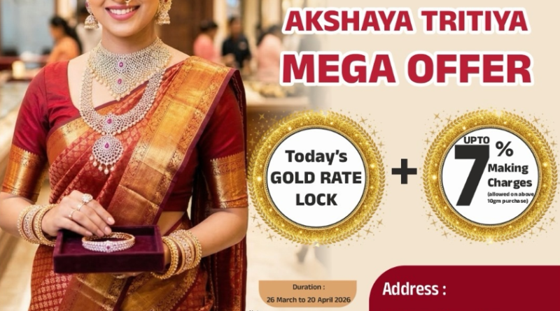 Mega Offer on this Akshaya Tritiya season. Lock Today’s Gold rate and get 7% on making charges (allowed on above 10gm purchase)